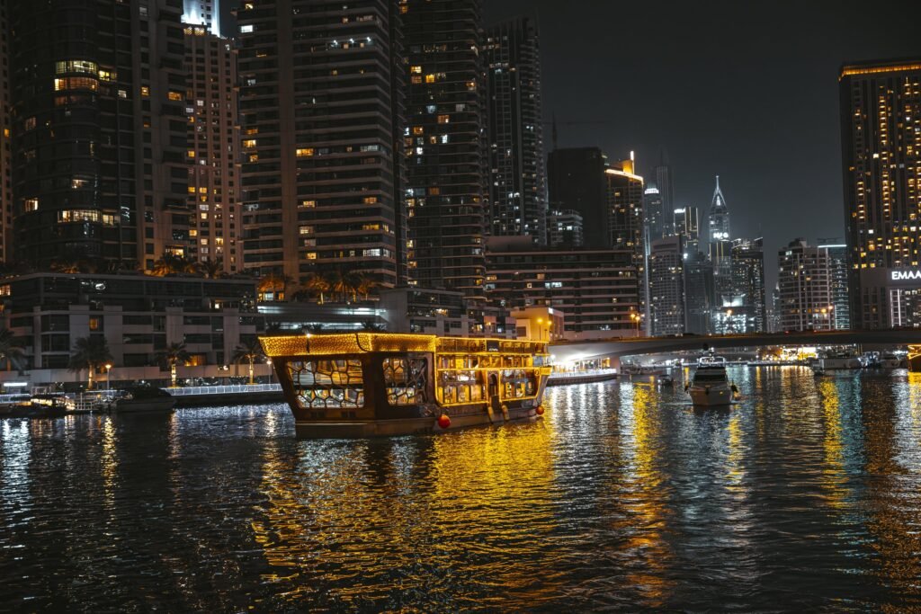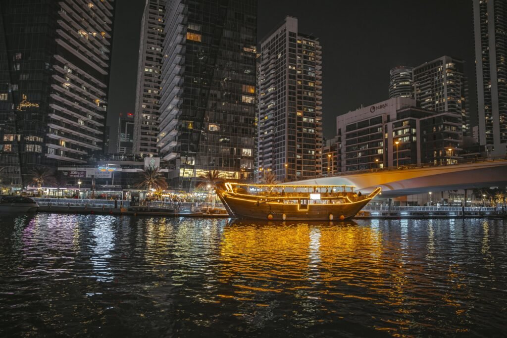 Dubai’nin eşsiz siluetini denizden izlemek isteyenler için Dhow Cruise turları unutulmaz bir deneyim sunar. Geleneksel Arap yelkenlileri olan “dhow” tekneleri, modern konforla birleştirilerek misafirlerine hem tarihî hem de lüks bir yolculuk yaşatır.